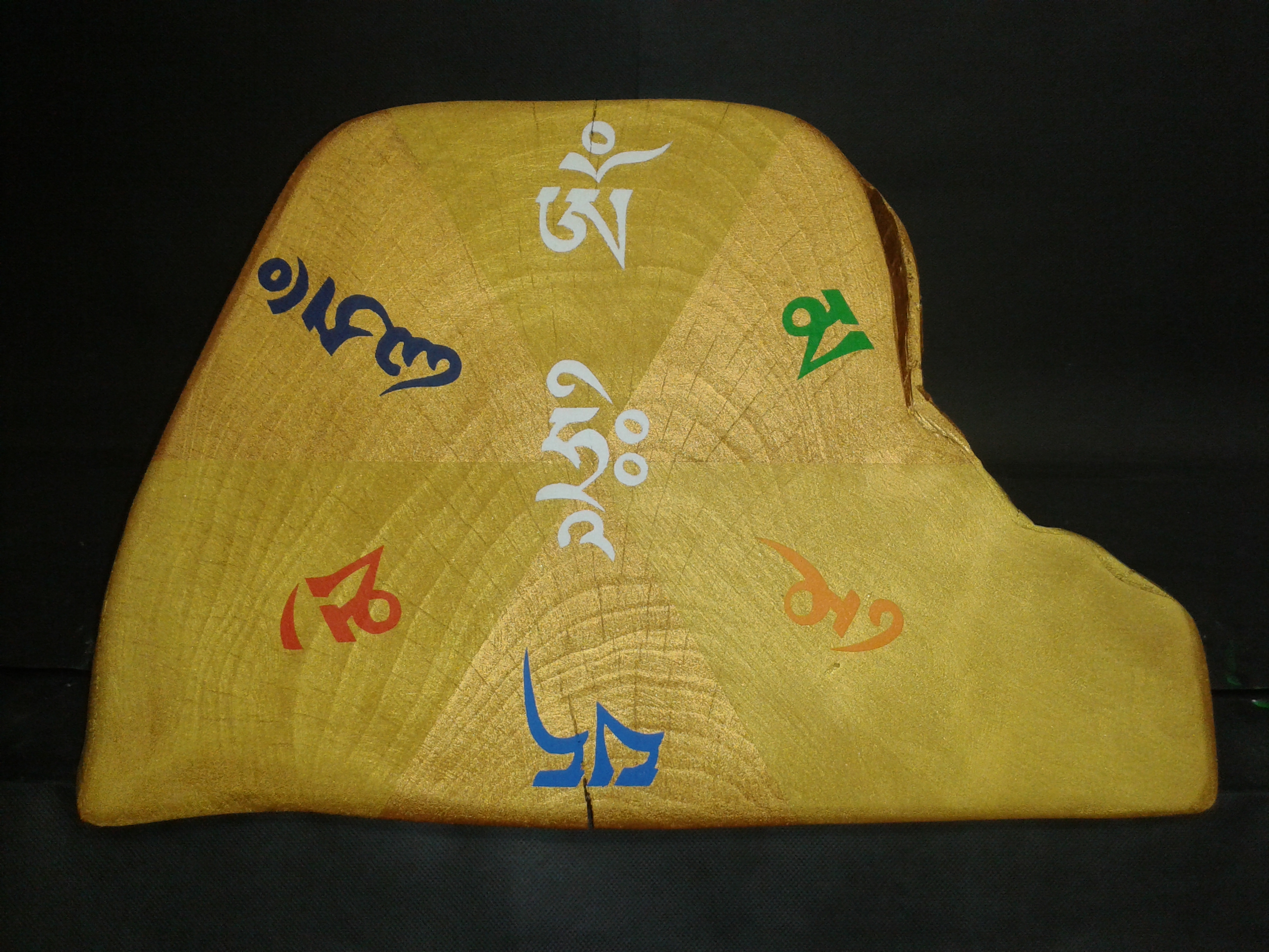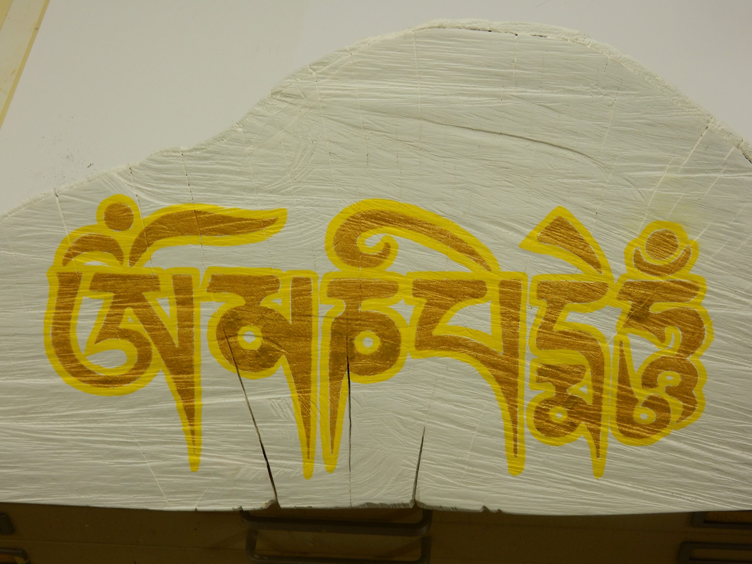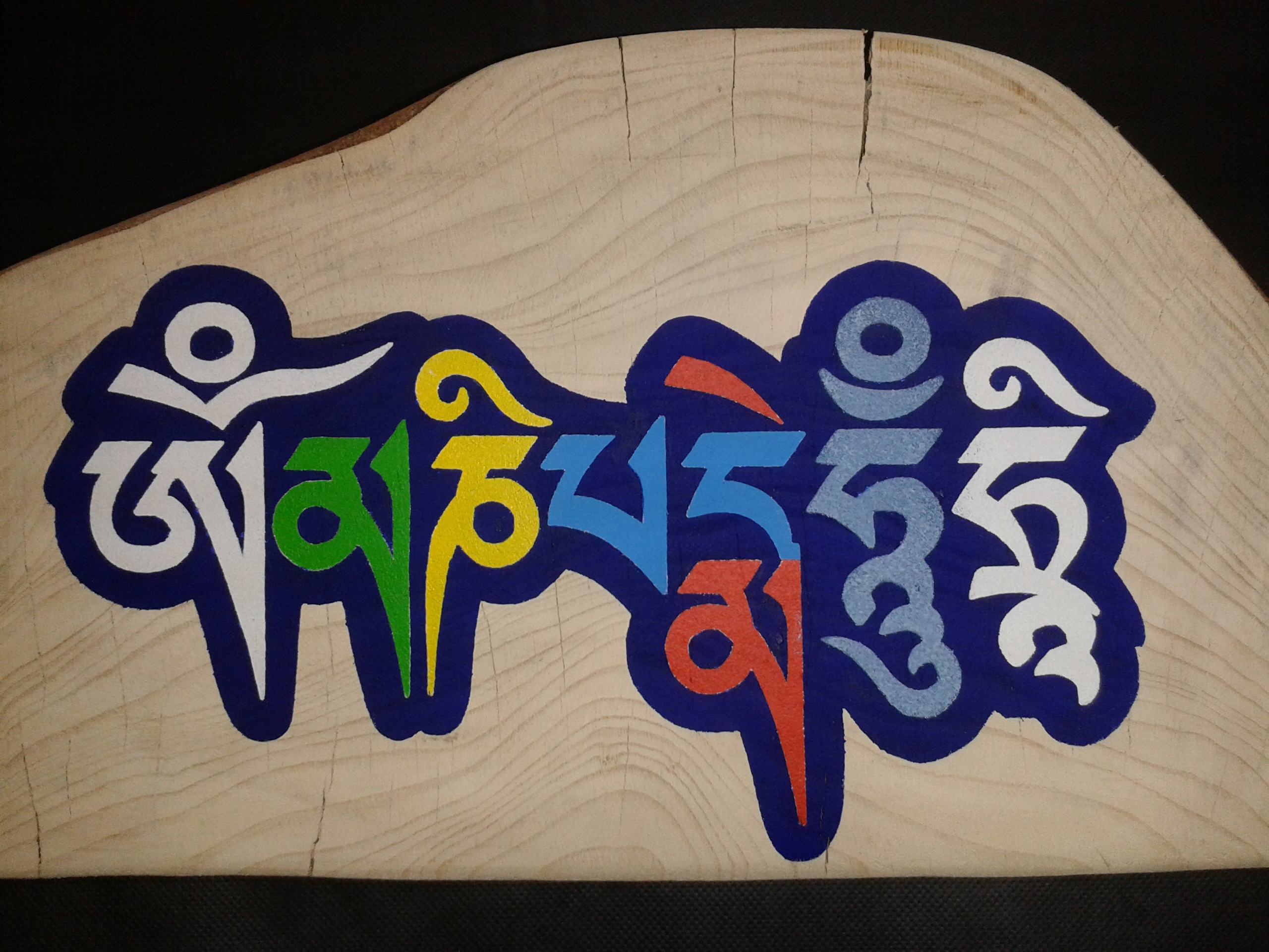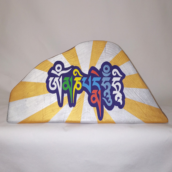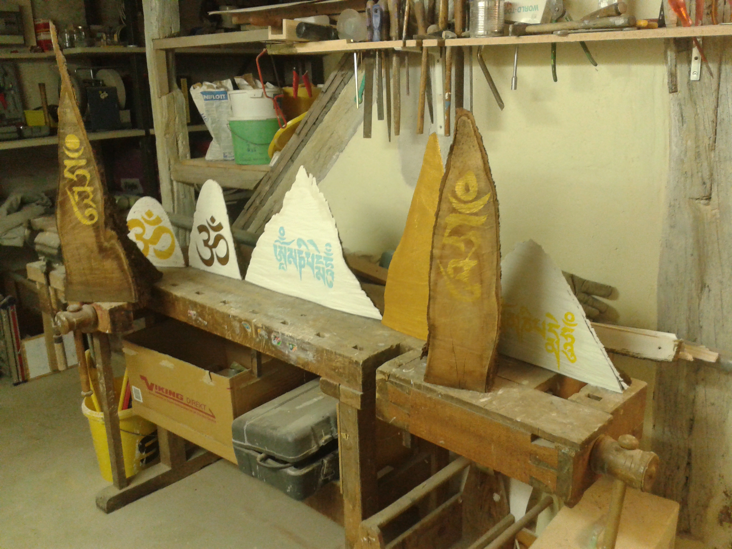 Martin Schnee bearbeitet die vorbehandelten Hölzer weiter. Er grundiert/ bemalt die Holzrohlinge. Auf dem farbigen Hintergrund bringt er ein Mantra an. Farben haben im tibetischen Buddhismus traditionell eine tiefere Bedeutung. Martin Schnee gestaltet Manihölzer in traditionellen Farben und befreit sich aber auch davon und kreiert seine eigenen Farbwelten. Er hat sich intensiv mit der Symbol – und Farbwelt des Buddhismus auseinandergesetzt und hatte die Gelegenheit bei seiner Pilgerreise nach Nepal Einblicke in die Tsering Artschool im Kloster shechen in Nepal zu bekommen.