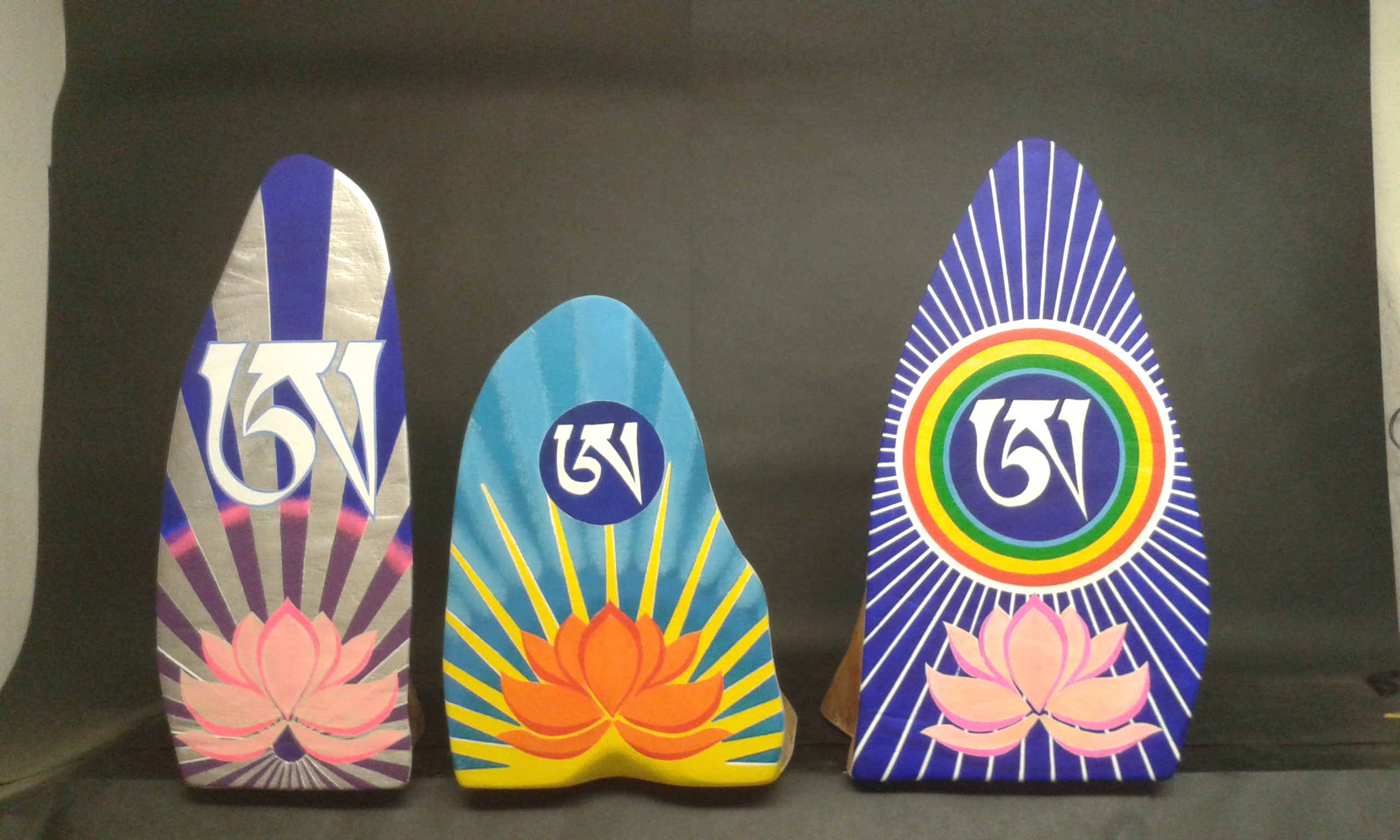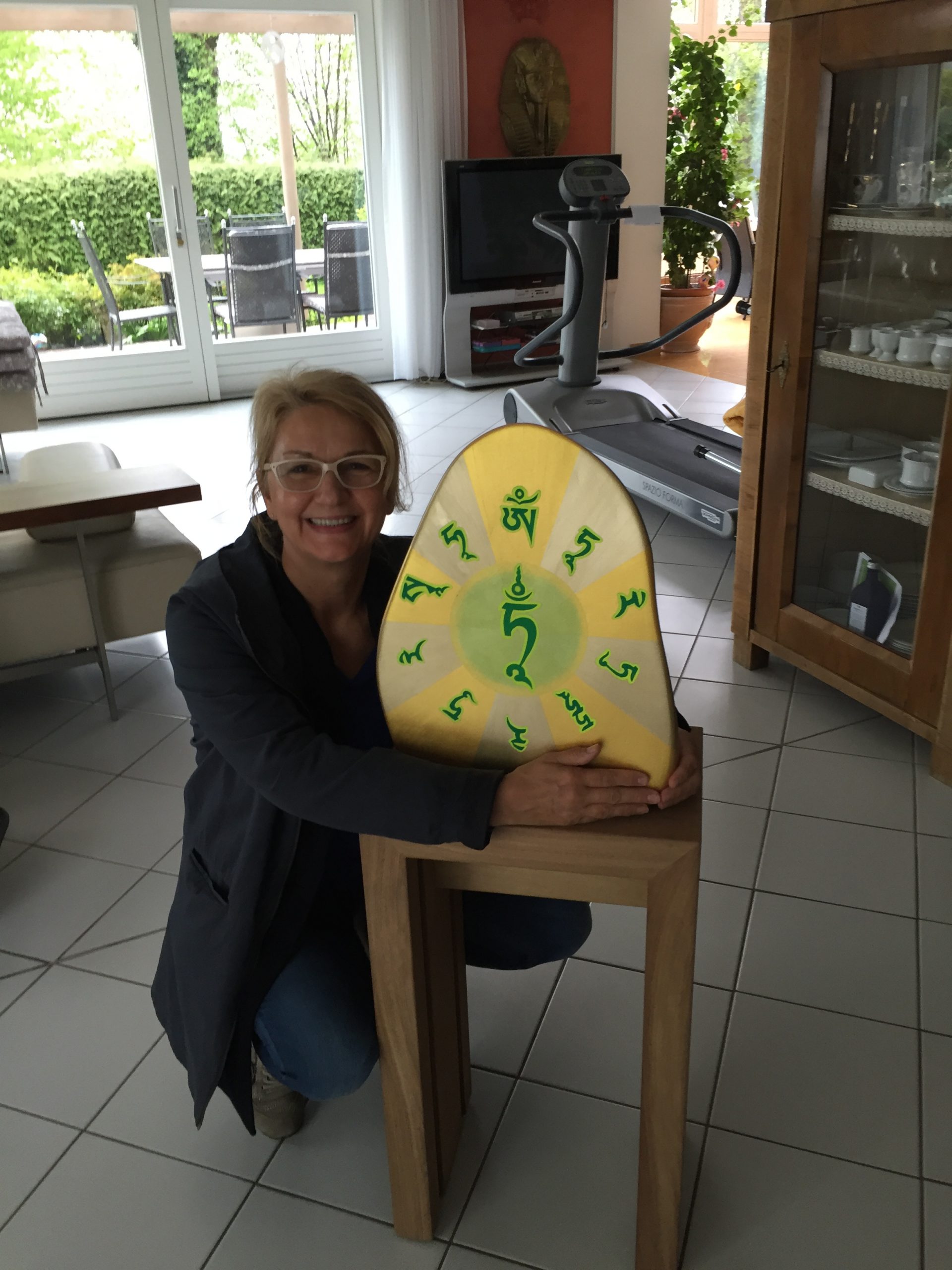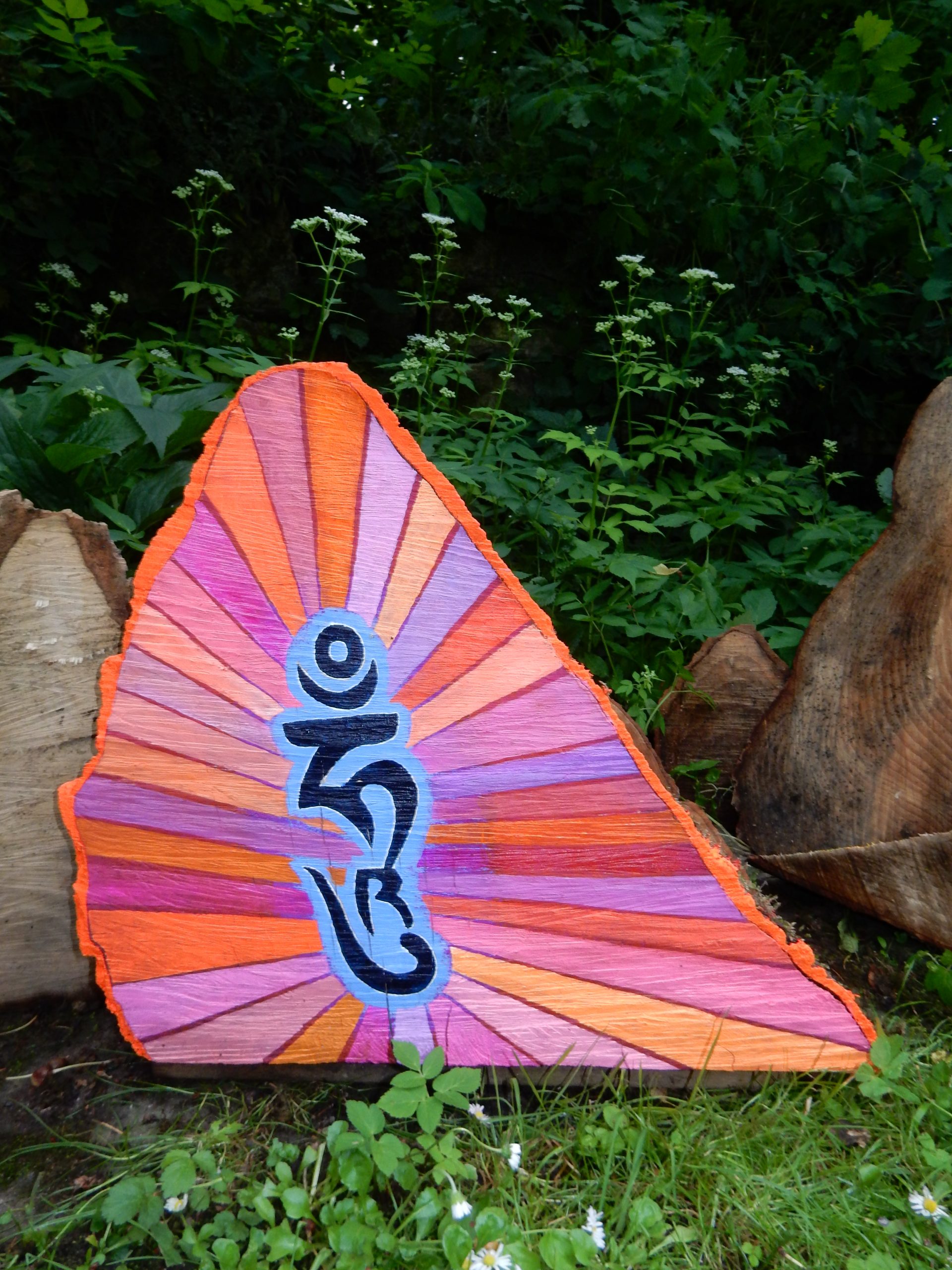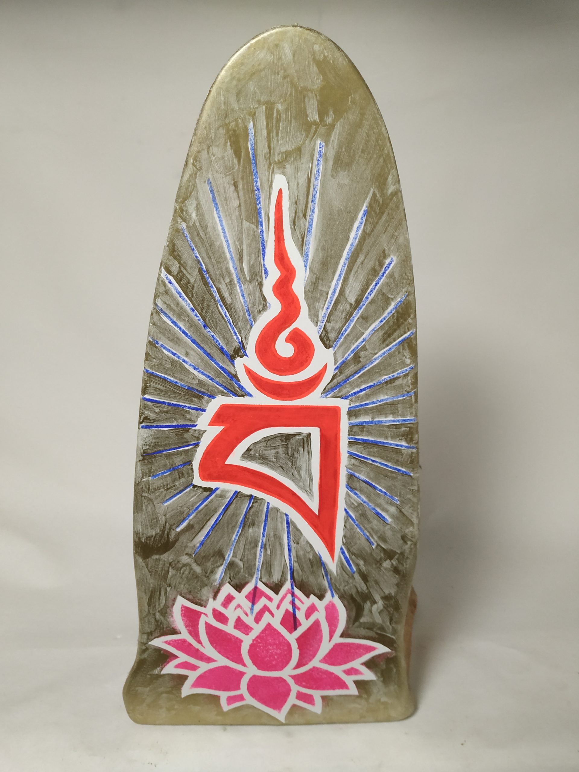 Martin Schnee bearbeitet die vorbehandelten Hölzer weiter. Er grundiert/ bemalt die Holzrohlinge. Auf dem farbigen Hintergrund bringt er ein Mantra an. Farben haben im tibetischen Buddhismus traditionell eine tiefere Bedeutung. Martin Schnee gestaltet Manihölzer in traditionellen Farben und befreit sich aber auch davon und kreiert seine eigenen Farbwelten. Er hat sich intensiv mit der Symbol – und Farbwelt des Buddhismus auseinandergesetzt und hatte die Gelegenheit bei seiner Pilgerreise nach Nepal Einblicke in die Tsering Artschool im Kloster shechen in Nepal zu bekommen.